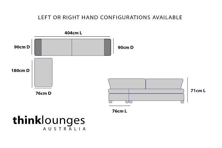 Dimensions of complete lounge: 404cm lounge at back by 90cm wide plus Ottoman 180cm lounge by 76cm wide.